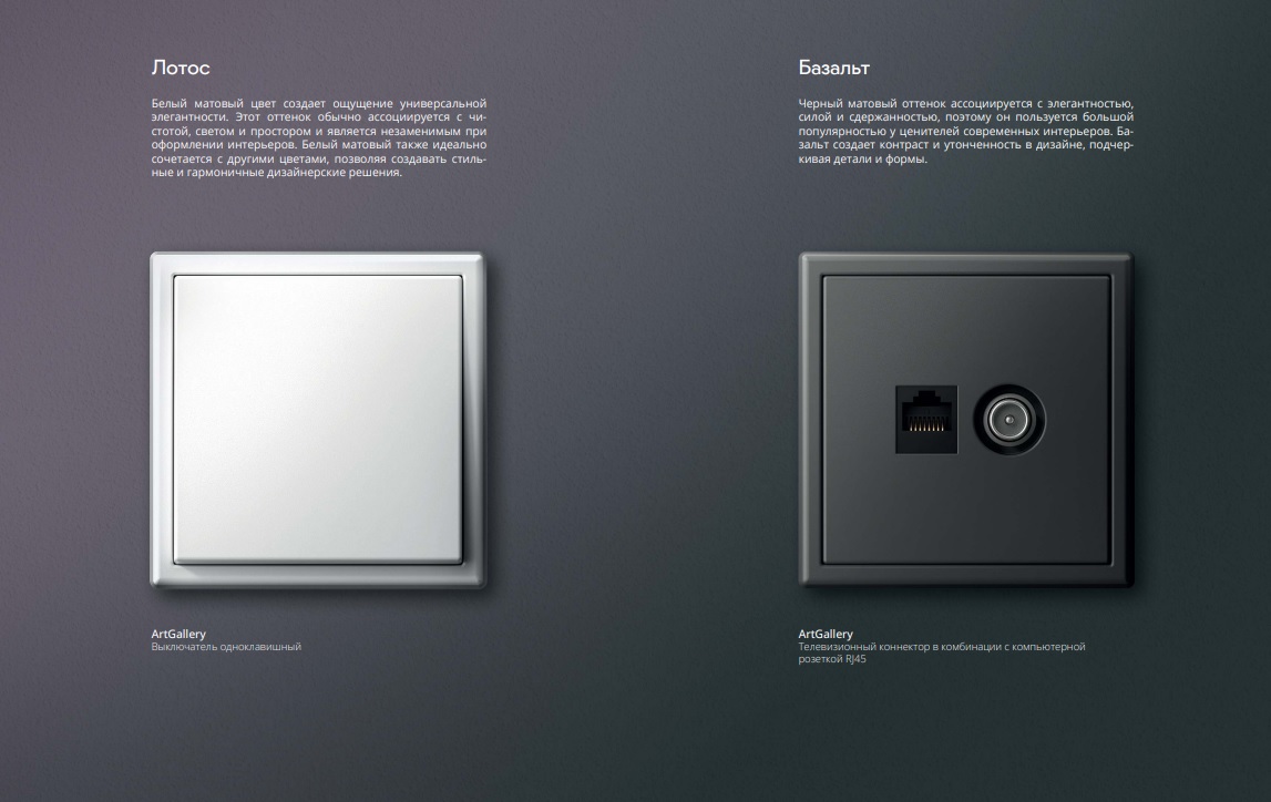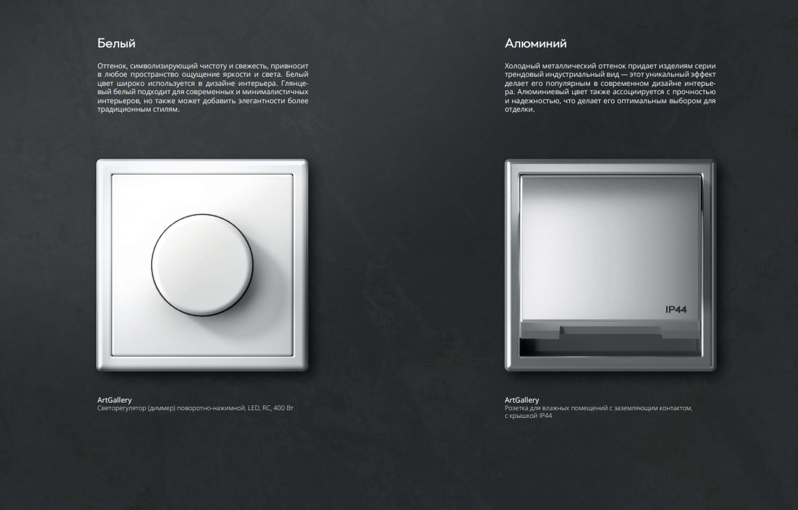 Например, в серии ArtGallery отсутствуют терморегуляторы, перекрёстные двухклавишные выключатели, трехклавишные выключатели, HDMI розетки, аудио розетки, коробки для наружного монтажа. Все эти изделия можно выбрать в серии AtlasDesign и установить с помощью специального адаптера в ArtGallery!