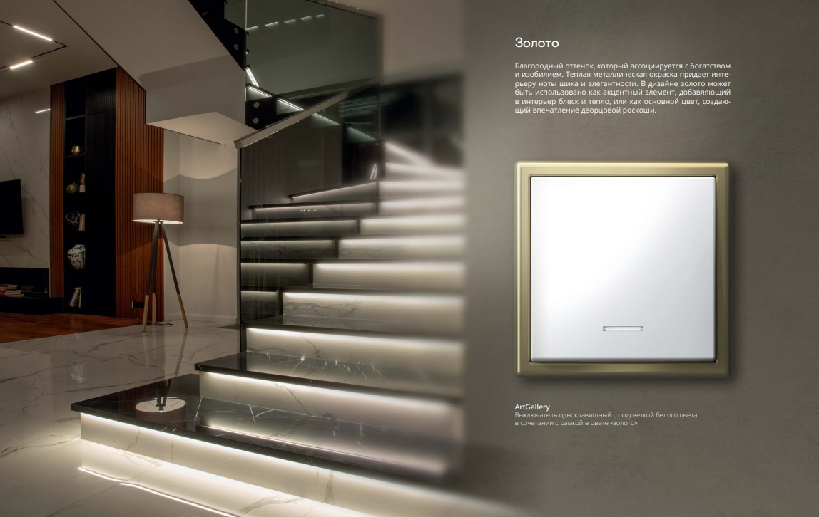 Серия ArtGallery выпускается в 12 основных цветах, в том числе и цвете золото. С помощью 12 цветовых решений можно дополнить любой интерьер, от спокойных лаконичных дизайнов до смелых ярких интерьеров.
