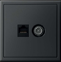 - Розетка двойная ТВ + RJ45. ТВ розетка, совмещенная с разъемом RJ-45, служит для подключения телевизоров к телевизионным сетям и интернету. Данное решение удобно для использования функций Smart TV и избавляет от необходимости прокладки дополнительных кабелей
