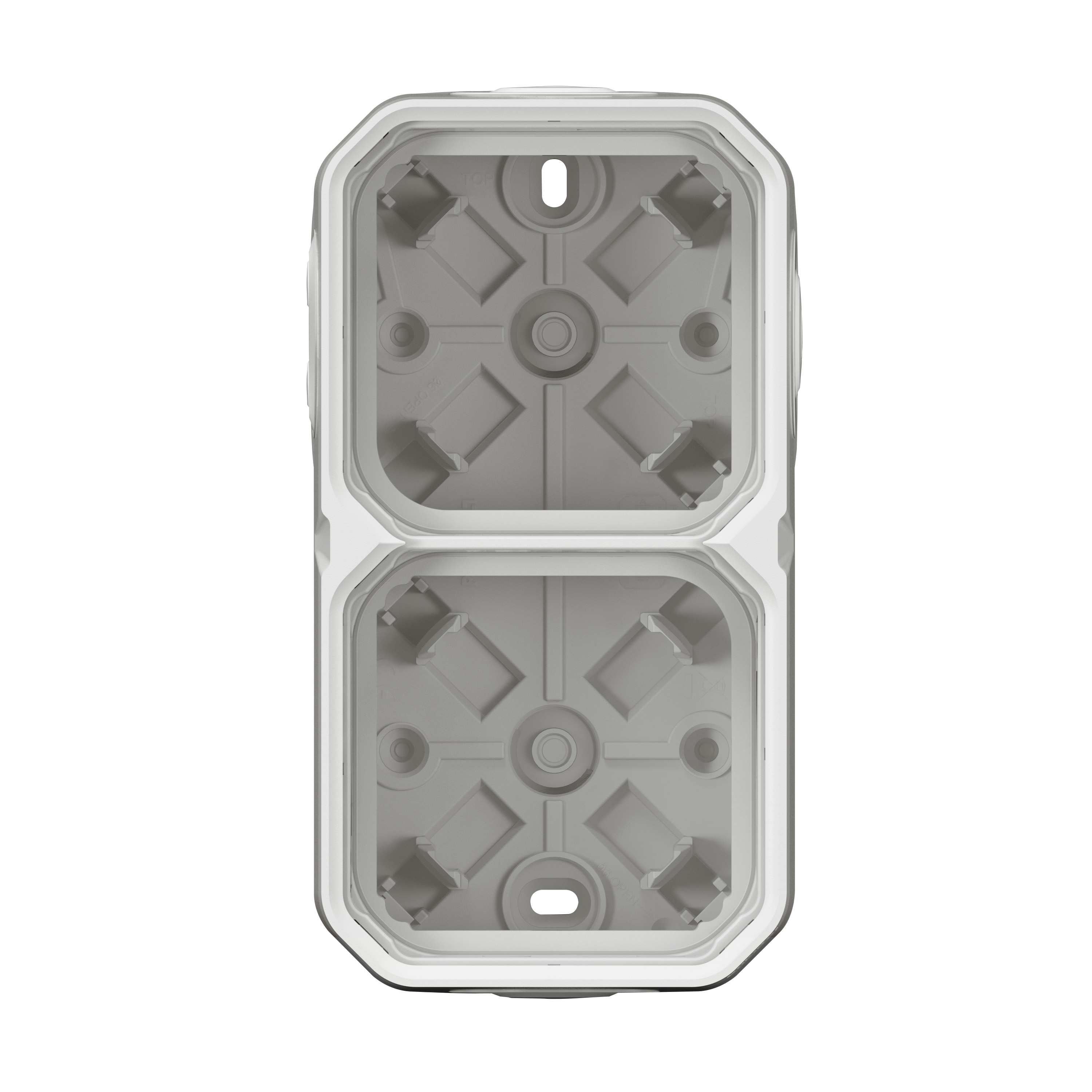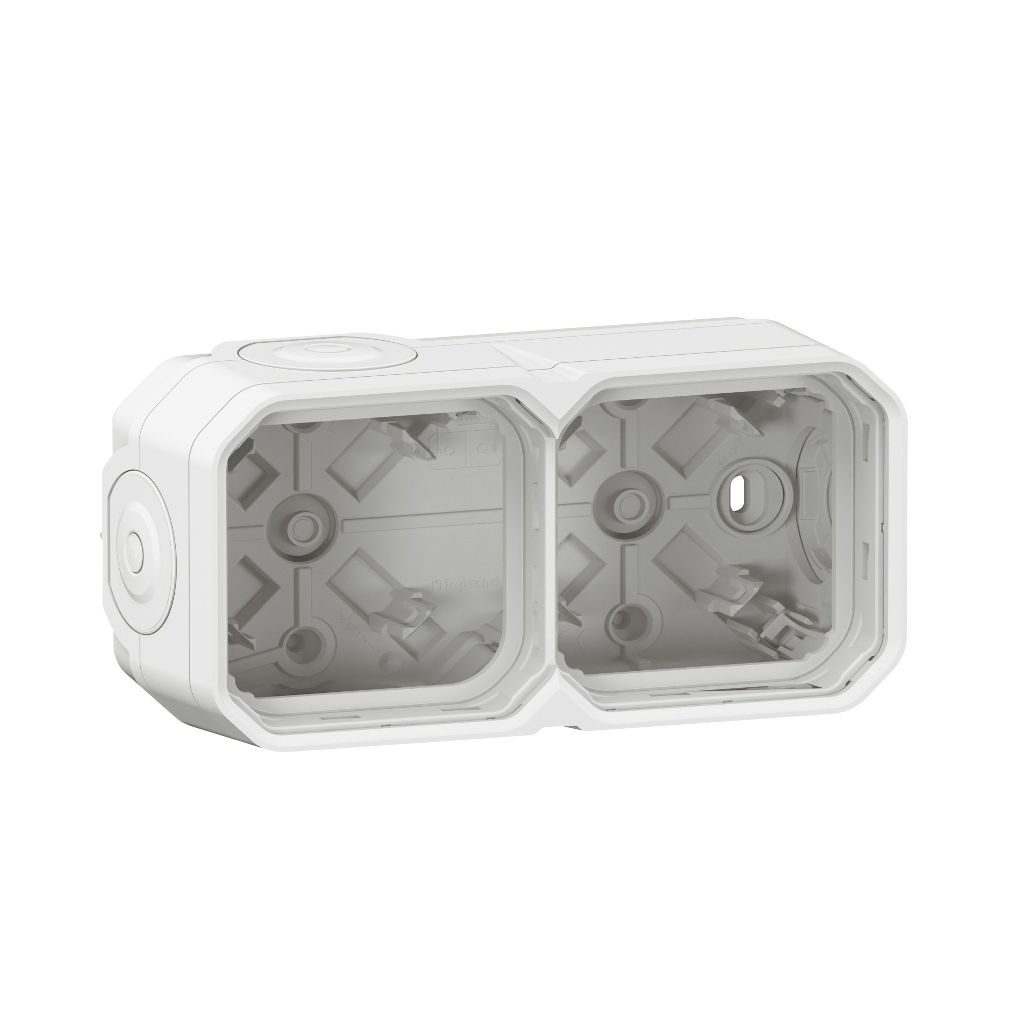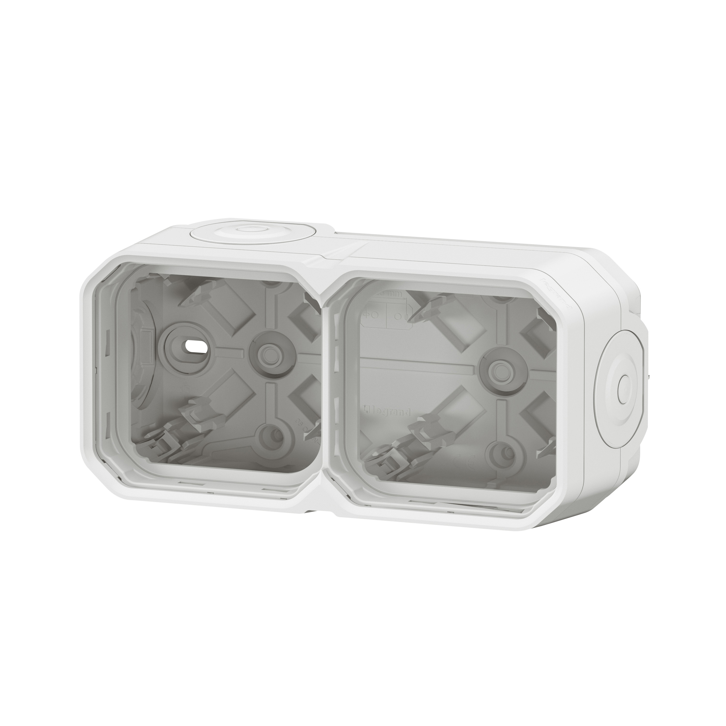 Водонепроницаемый накладной корпус LEGRAND Plexo (артикул 069690L) предназначен для установки двух горизонтальных или вертикальных механизмов на поверхности. Корпус выполнен в белом цвете и обладает герметичностью IP55, что защищает подключенные устройства от пыли и воды, обеспечивая надежную эксплуатацию в любых влажных помещениях.