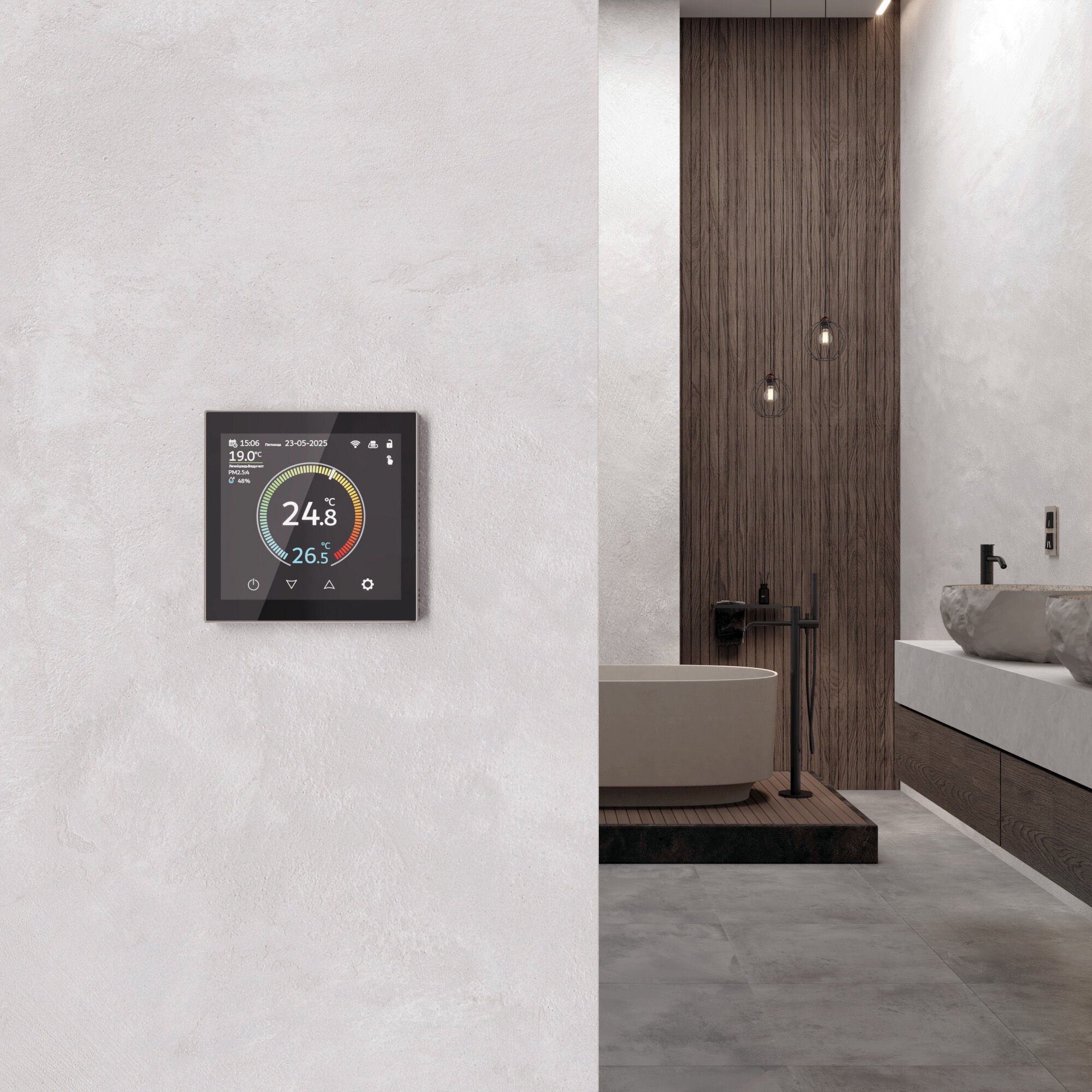 Умный сенсорный терморегулятор Werkel (артикул W1851104) — это современный терморегулятор для теплого пола и систем обогрева, который сочетает премиальный дизайн, расширенный функционал и удобное управление. Дымчатый безрамочный корпус из закалённого стекла и поликарбоната визуально облегчает устройство и гармонично смотрится в любых современных интерьерах, особенно в сочетании с серыми и графитовыми рамками из раздела «Werkel механизмы дымчатые». Сенсорный TFT‑IPS‑LCD дисплей с высокой чувствительностью и широким углом обзора делает управление интуитивным и наглядным: все основные параметры отображаются прямо на экране без необходимости постоянно пользоваться приложением.
