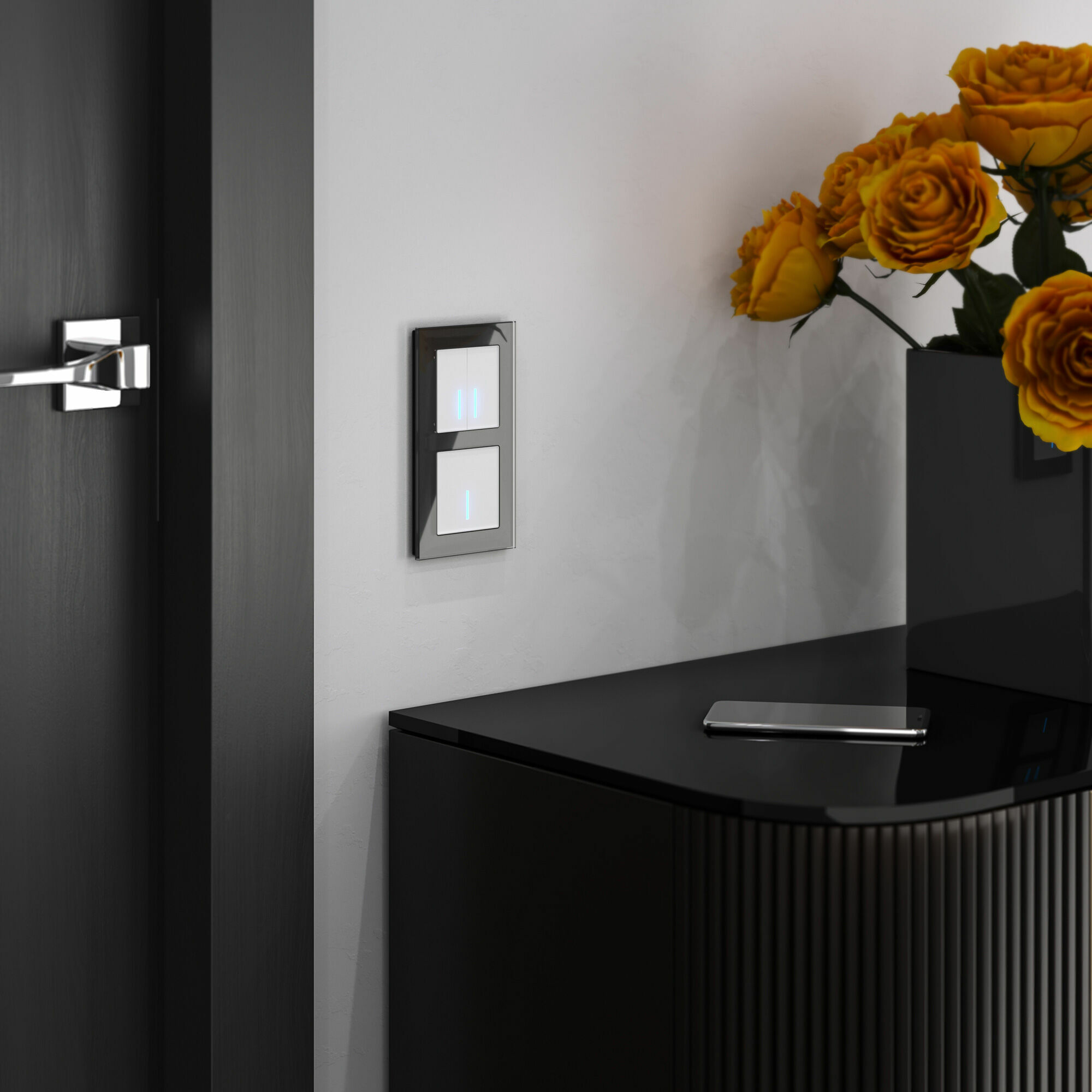 Сенсорный выключатель имеет стеклянную поверхность Soft-touch, которая обладает приятным тактильным эффектом. За счет матового фактурного покрытия лицевая панель не бликует и на ней не остается следов.