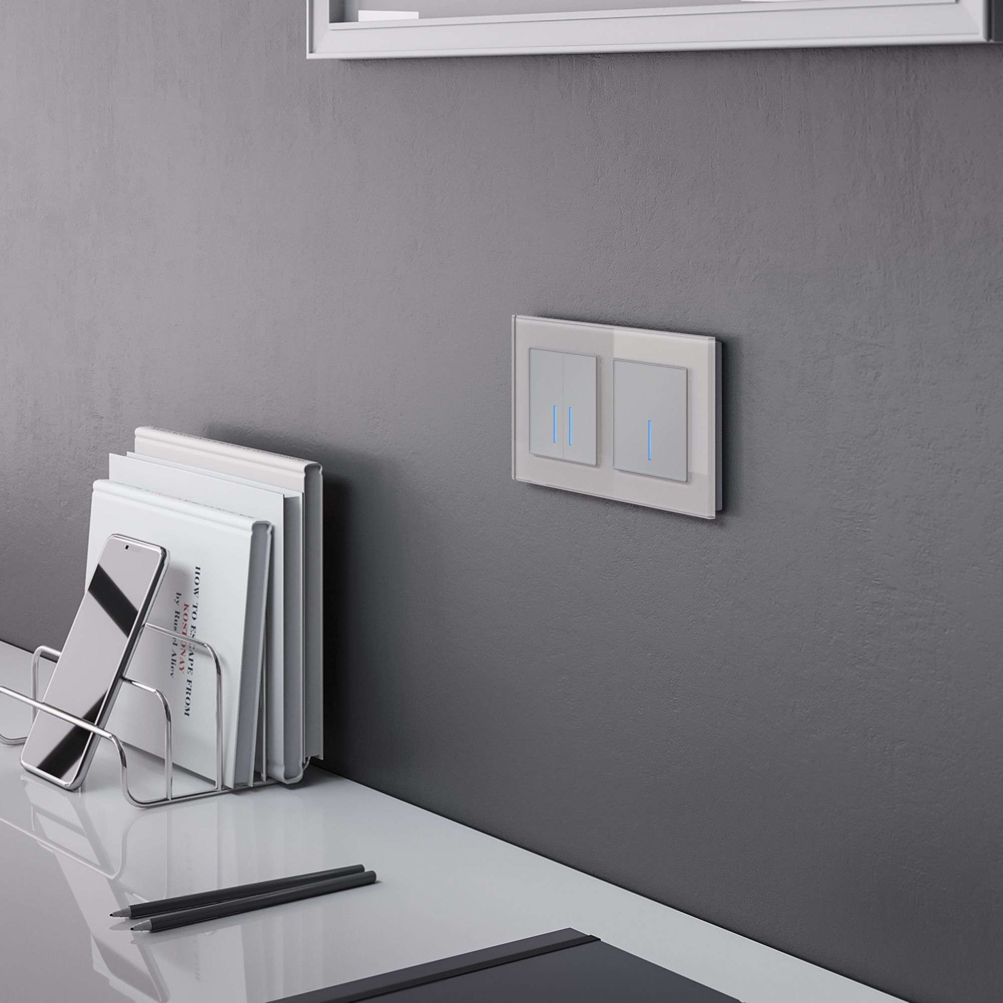 Для подключения дополнительных выключателей в проходные схемы не требуется прокладка кабеля к остальным выключателям. Логика работы всех выключателей легко задается и изменяется под потребности в приложении Minimir Home.