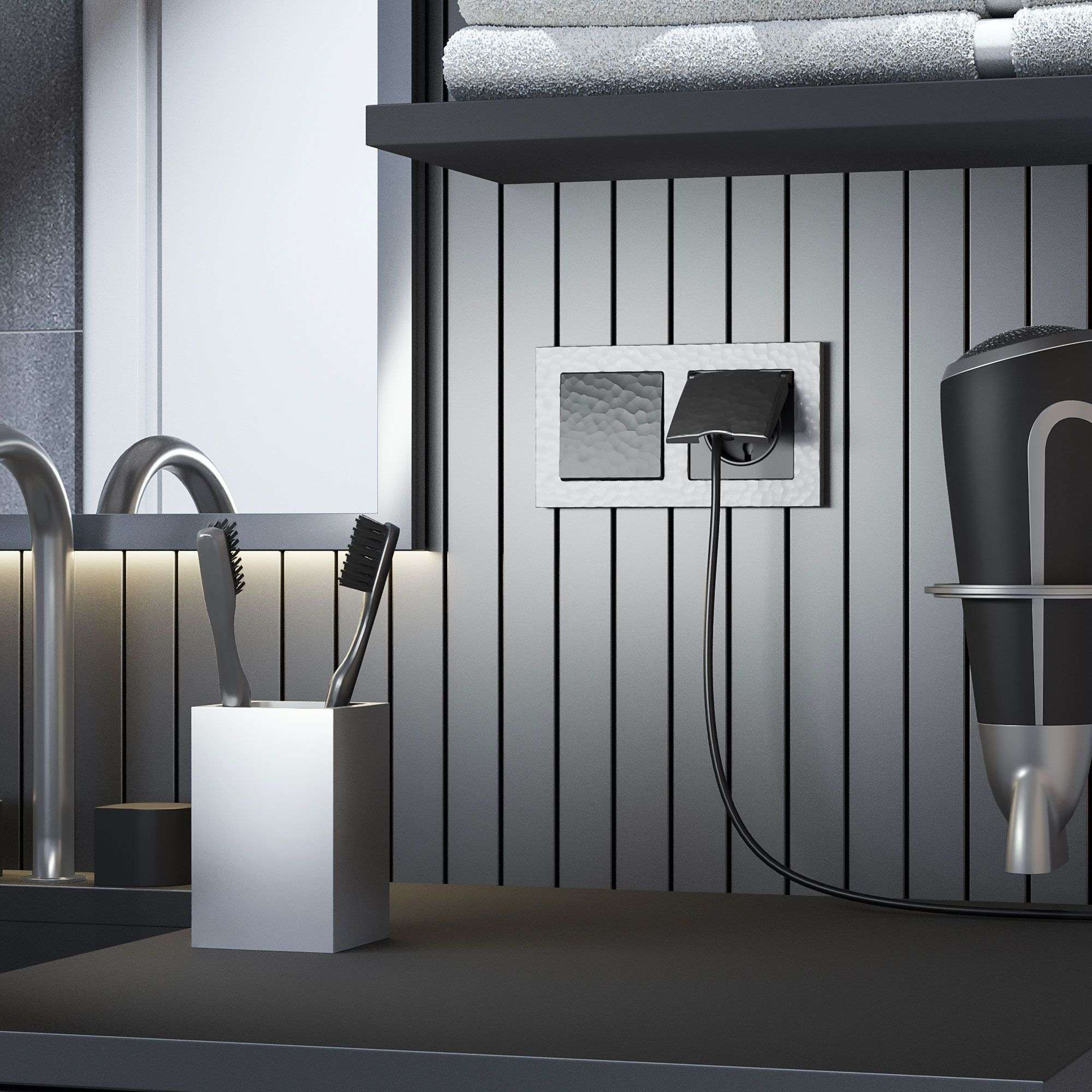 Электроустановочное изделие монтируется в установочную коробку, оставляя видимым только внешнюю лицевую панель и накладную рамку. Механизм для скрытой установки оснащен суппортом из нержавеющей стали, позволяющий крепко зафиксировать изделие в подрозетнике. Надежные контакты из фосфористой бронзы и серебра выдерживают большую нагрузку и обладают большим эксплуатационным ресурсом 40 000 циклов.