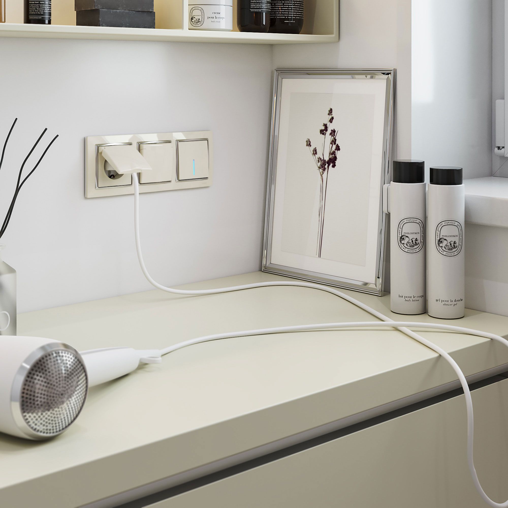 Электроустановочное изделие монтируется в установочную коробку, оставляя видимым только внешнюю лицевую панель и накладную рамку. Механизм для скрытой установки оснащен суппортом из нержавеющей стали, позволяющий крепко зафиксировать изделие в подрозетнике. Надежные контакты из фосфористой бронзы и серебра выдерживают большую нагрузку и обладают большим эксплуатационным ресурсом 40 000 циклов.