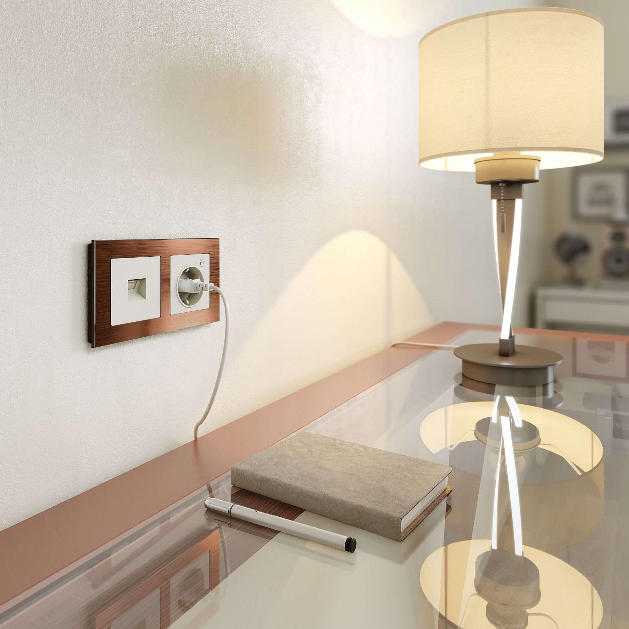 Механизм монтируется в установочную коробку, оставляя видимым только внешнюю лицевую панель и декоративную рамку. Компьютерная розетка для скрытой установки оснащена суппортом из нержавеющей стали и распорными лапками, позволяющие крепко зафиксировать изделие в подрозетнике.