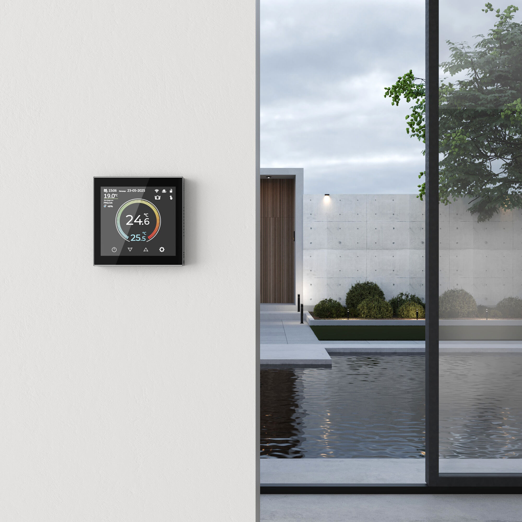 Корпус выполнен из закаленного стекла и поликарбоната, что делает устройство стойким к царапинам и механическим воздействиям, а также подчеркивает премиальный внешний вид. Цвет изделия — черный, наличие подсветки облегчает чтение информации на экране в темное время суток. Габариты терморегулятора: длина 86 мм, ширина 42 мм, высота 86 мм — эти размеры позволяют устанавливать устройство в стандартные монтажные коробки и легко совмещать его с другими механизмами и рамками.