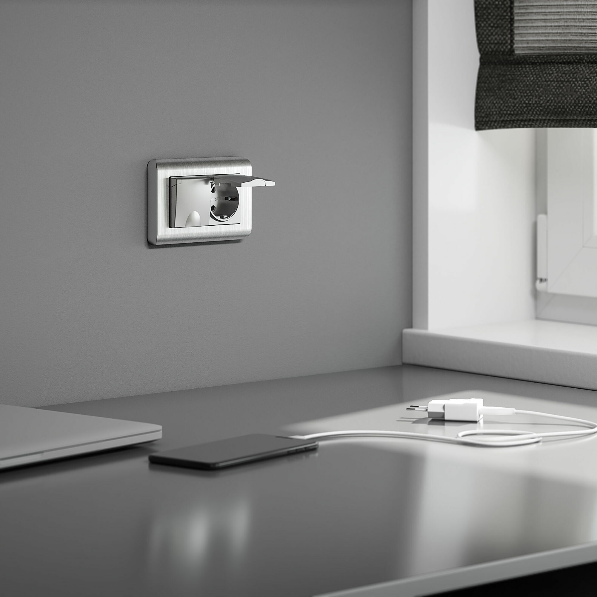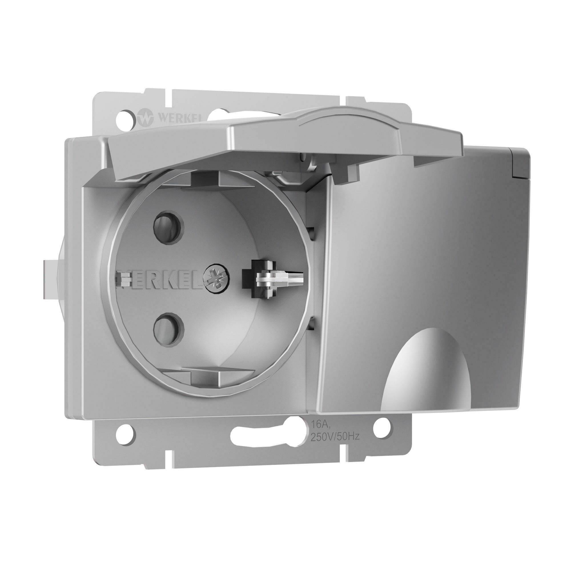 Встраиваемая розетка с заземлением совместима со всеми рамками из коллекций Werkel™, характеризуется удобством использования и обеспечивает надежный контакт.