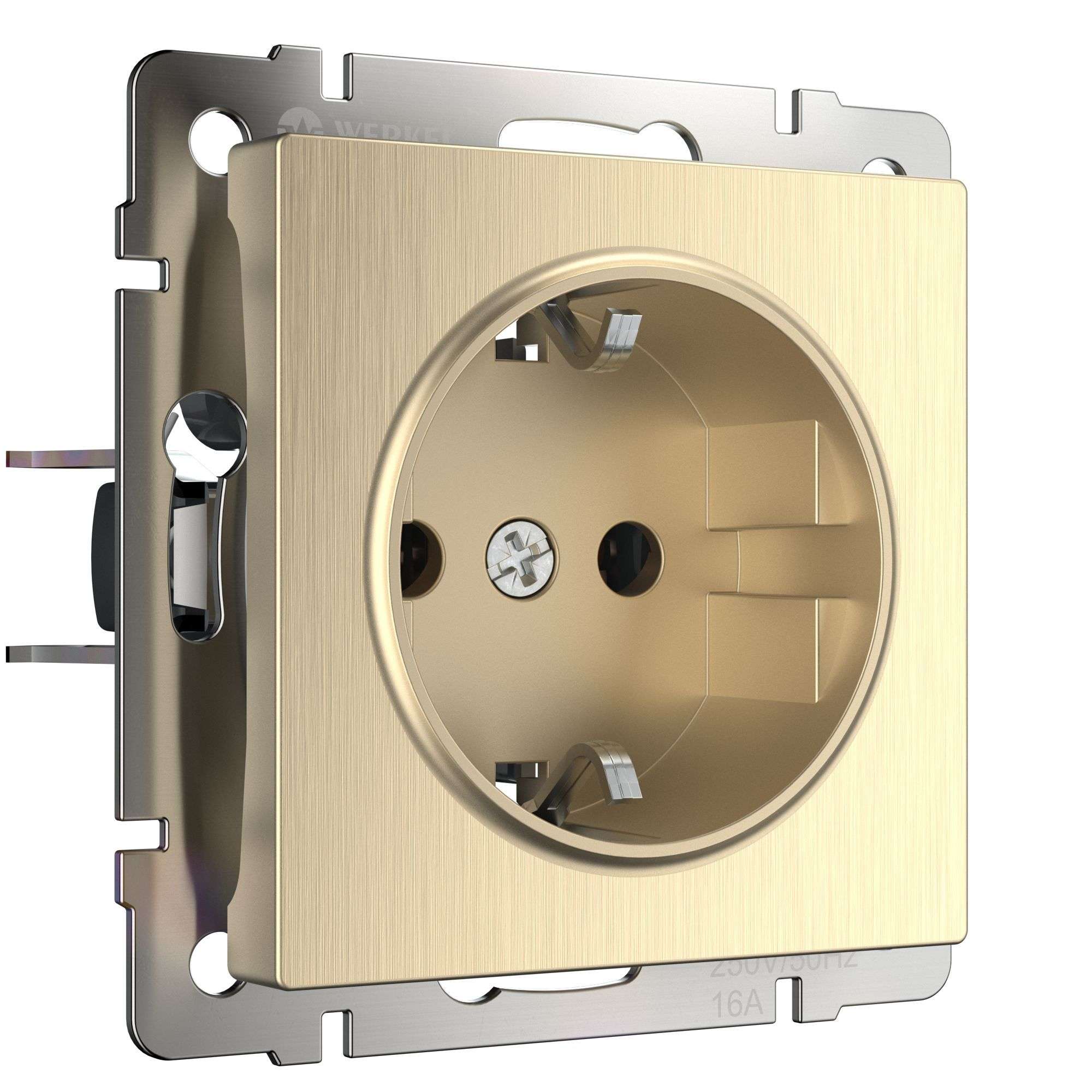 Механизм с суппортом из нержавеющей стали устанавливается в подрозетник и надежно фиксируется с помощью винтов и распорных лапок. Розетка оборудована защитными шторками, обеспечивающие дополнительную безопасность.