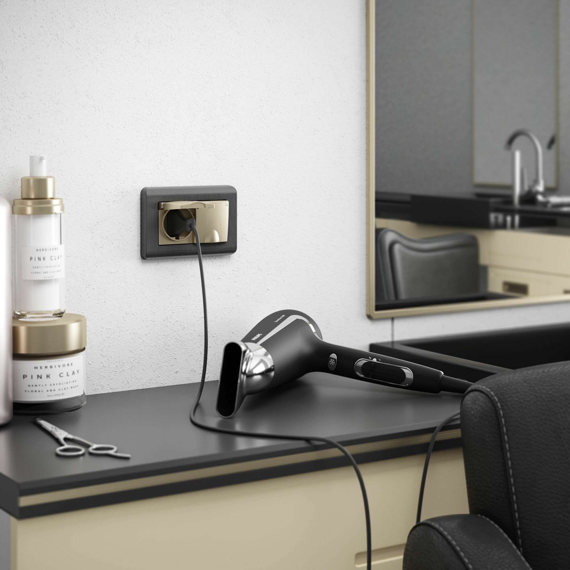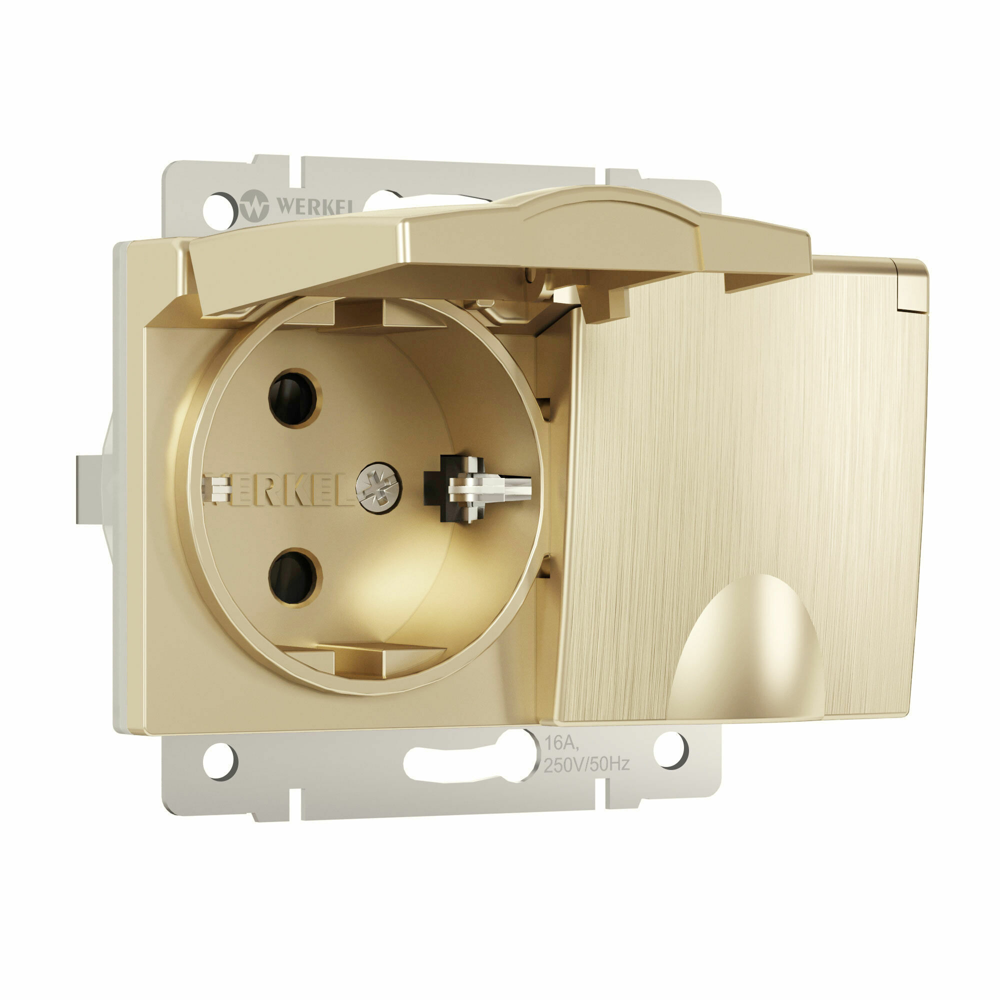 Встраиваемая розетка с заземлением совместима со всеми рамками из коллекций Werkel™, характеризуется удобством использования и обеспечивает надежный контакт.
