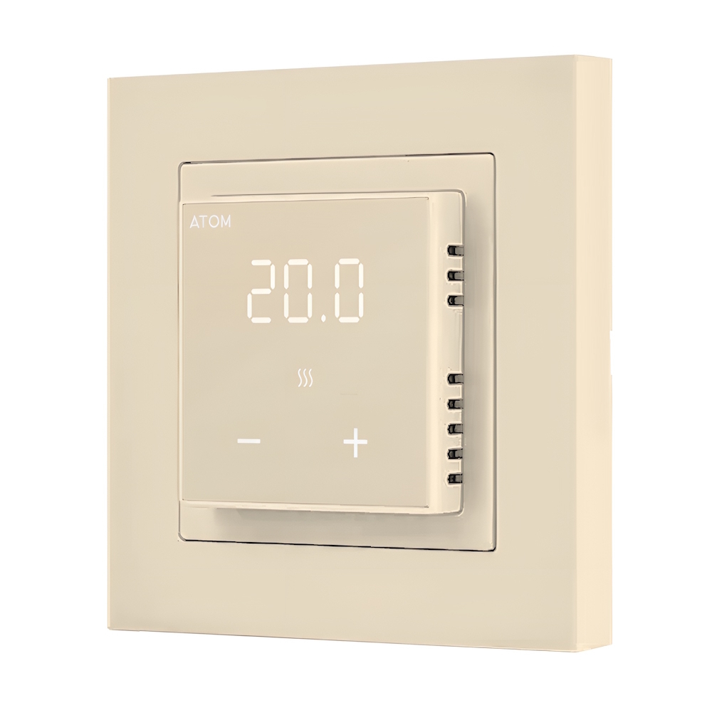 Цифровой терморегулятор ATOM Delta слоновая кость 16А CN2677 — это современное устройство для точного управления электрическим теплым полом. Оно обеспечивает комфортную температуру в помещении, позволяя легко регулировать нагрев в любое время суток. Благодаря стильному дизайну и продуманной конструкции терморегулятор гармонично вписывается в интерьер и совместим с декоративными рамками большинства производителей.