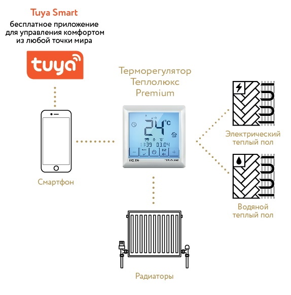 Удаленное управление обогревом пола осуществляется по сети Wi-Fi напрямую со смартфона с установленным приложением TUYA или через домашний Wi-Fi роутер (в комплект поставки не входит).